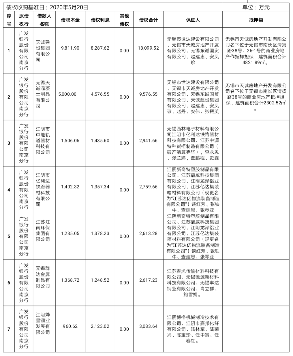 天誠建設(shè)集團(tuán)有限公司等22戶債權(quán)資產(chǎn)為我公司于2020年6月自廣發(fā)銀行股份有限公司南京分行收購資產(chǎn),對應(yīng)債權(quán)本金44,438.86萬元,利息47,607.87萬元,孳生息0元(計算至2020年5月20日),其他債權(quán)0元,債權(quán)合計92,046.73萬元。
